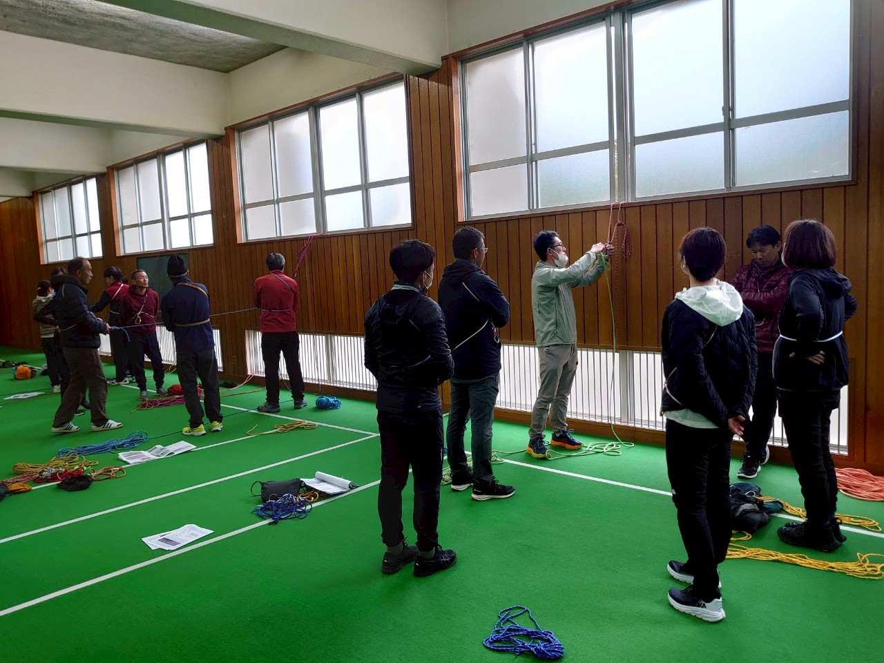 積雪期の救助訓練ということで当初谷峠での訓練を予定していたが、天気が不安定で雨予報のため、鶴来の舟岡山体育館に場所を変更しての訓練となった。
